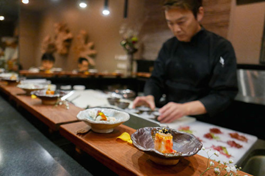 주방장이 만드는 특선요리의 개념으로 주방장이 엄선한 식재료로 만든 요리를 코스로 손님에게 내어주는 것을 말합니다. '주방특선요리' 형식의 일식 요리이지요.