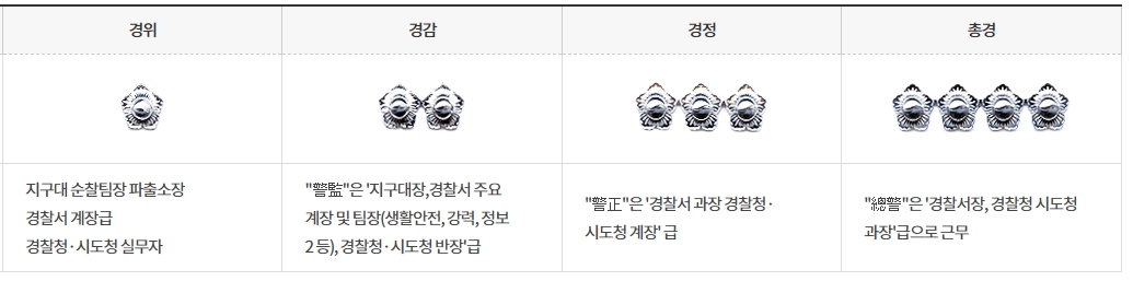 경위 : 6급(을) 공무원에 해당하며 무궁화 1개입니다. 지구대 순찰팀장, 파출소장, 경찰청이나 지방청 실무자로 근무합니다.