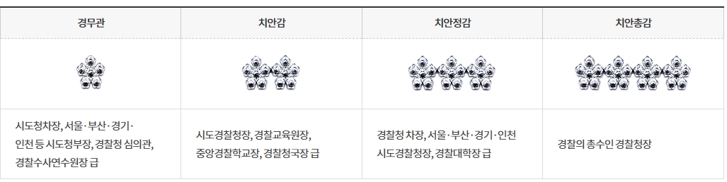 치안정감 : 1급 공무원에 해당하며 태극무궁화 3개입니다. 경찰청 차장, 지방청 경찰청장, 경찰대 학장직을 수행합니다.
